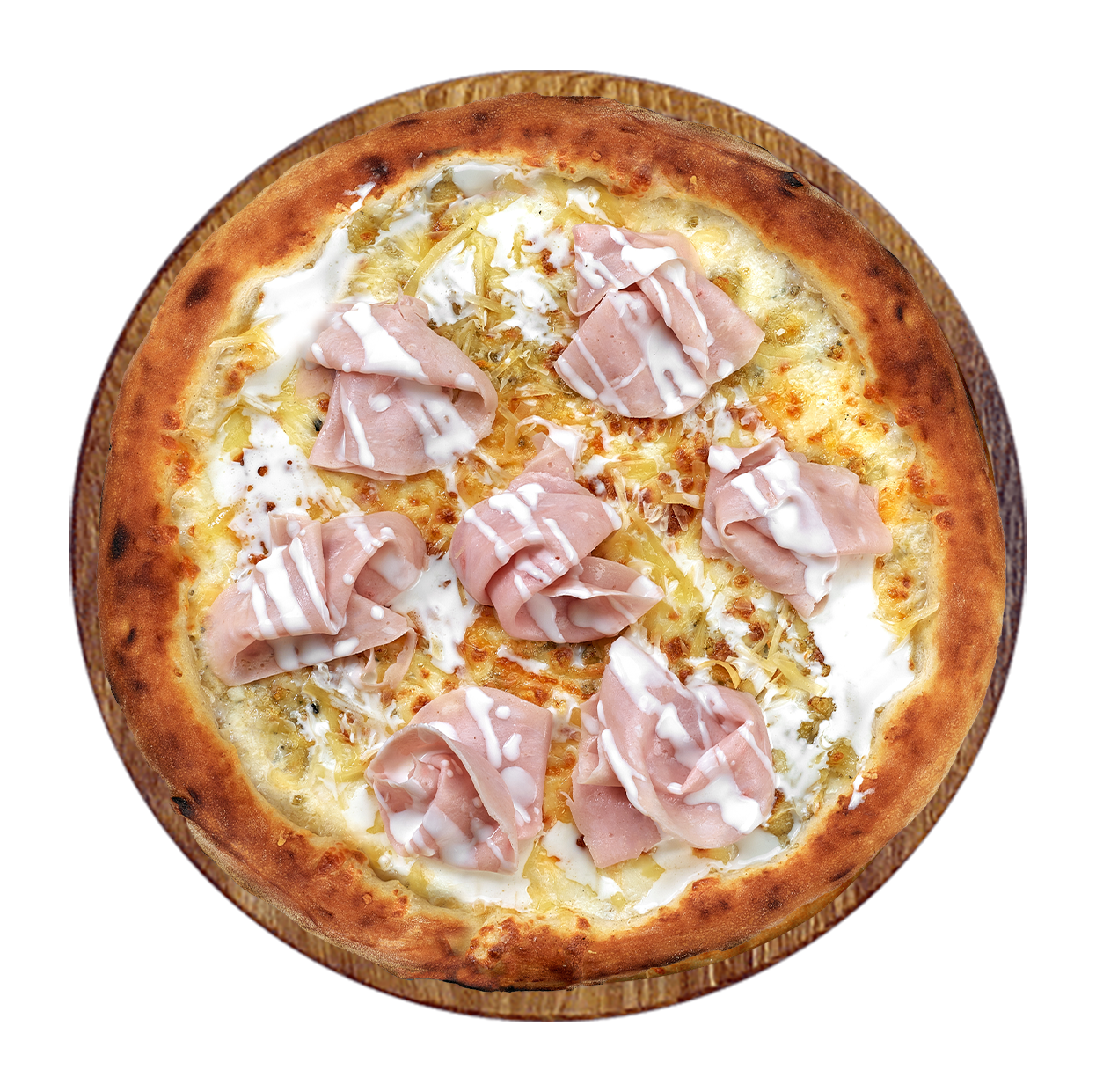 Crème fraîche, jambon, reblochon, pommes de terre, oignons.