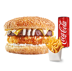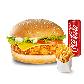 Poulet pané, cheddar. Servi avec frites et 1 boisson 33cl au choix.