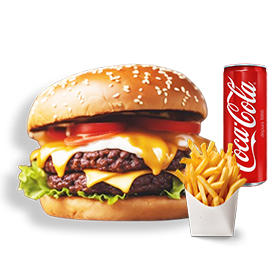 2 Steaks, 2 cheddar. Servi avec frites et 1 boisson 33cl au choix.