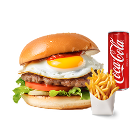 1 Steak, 1 oeuf, cheddar. Servi avec frites et 1 boisson 33cl au choix.