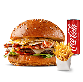 1 Steak 180g, oeuf, bacon, cheddar. Servi avec frites et 1 boisson 33cl au choix.