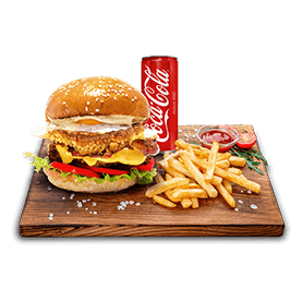 Steak de poulet, cheddar, salade, tomates, oignons.