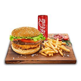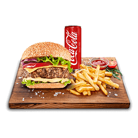 2 Steaks 80gr, cheddar, salade, tomates, oignons.