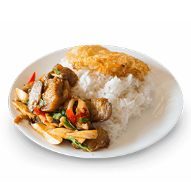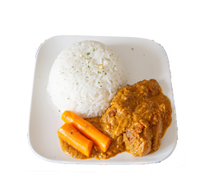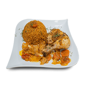 Un classique sénégalais: riz parfumé cuisiné dans une sauce savoureuse, accompagnée morceaux de poulet tenders et de légumes frais mijotés.