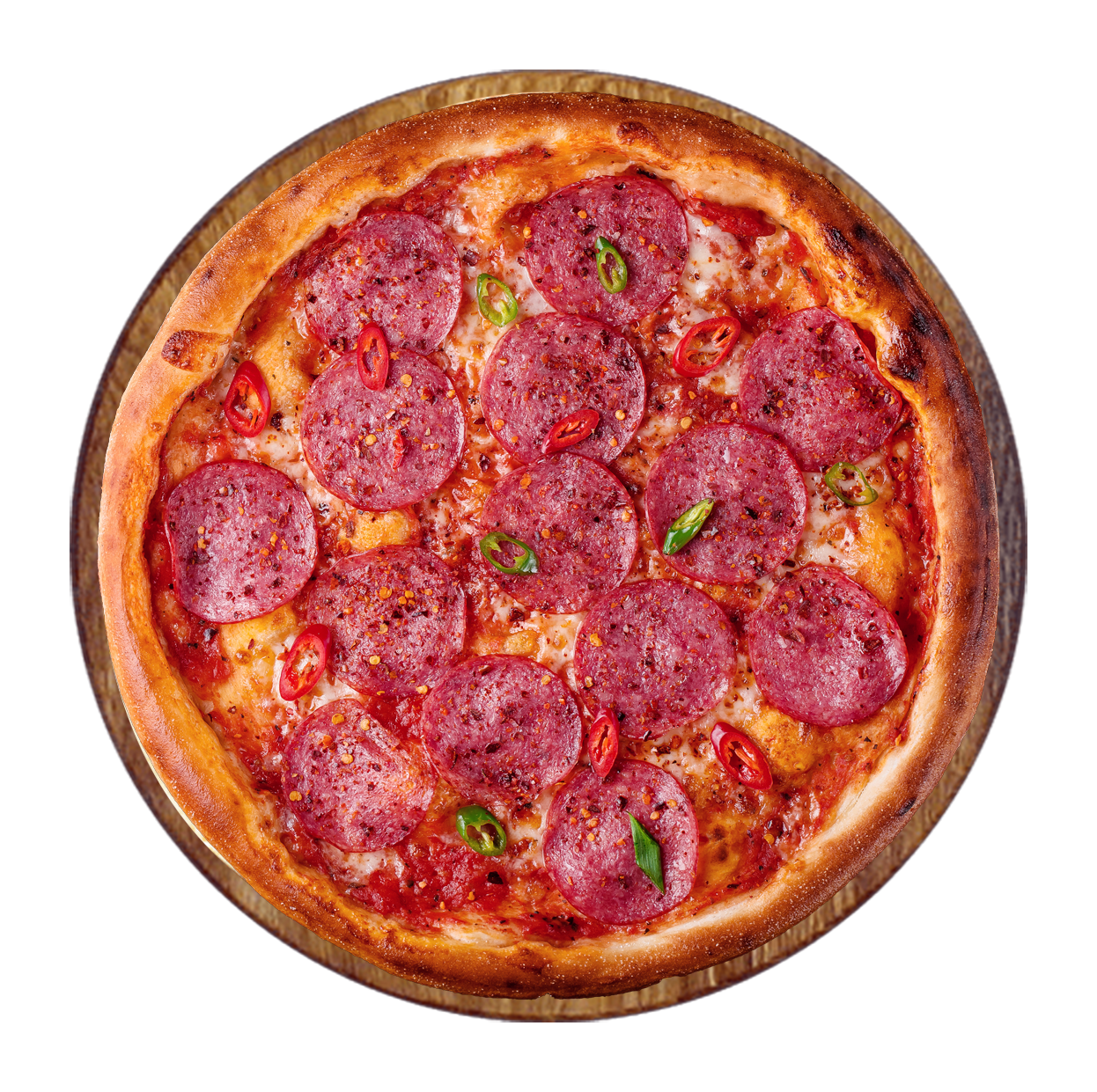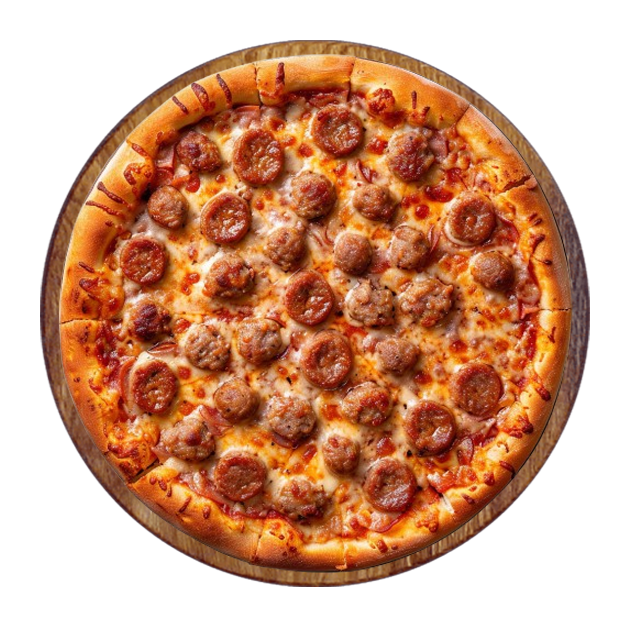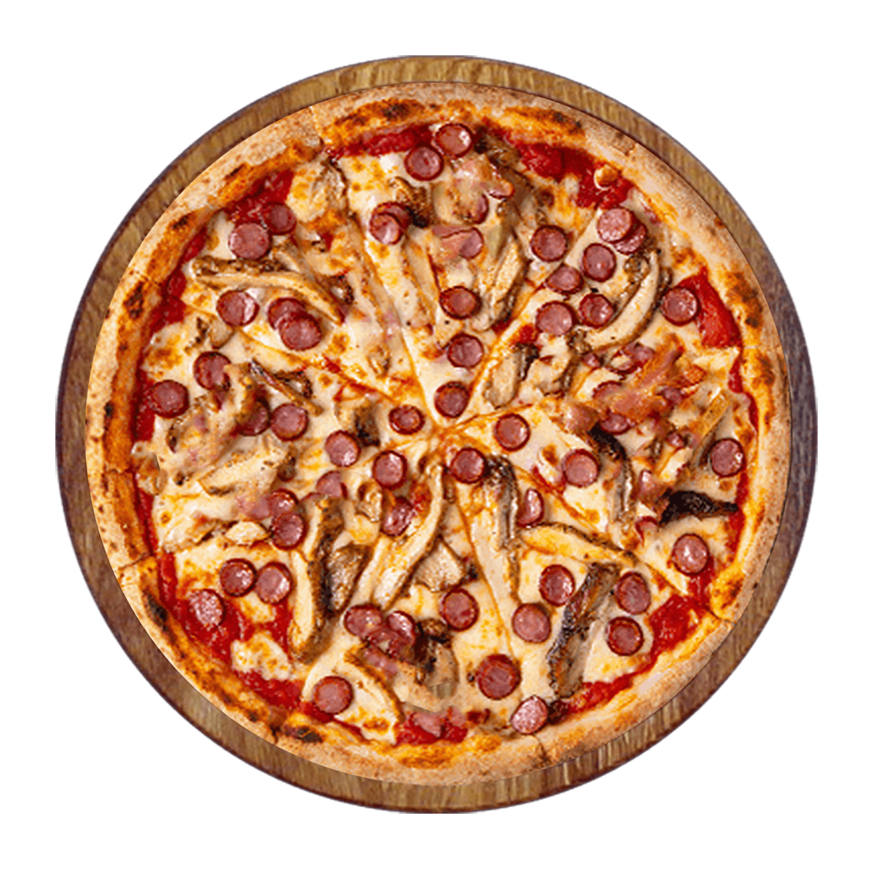 Tomate, fromage, jambon, bacon, chorizo, pepperoni.
