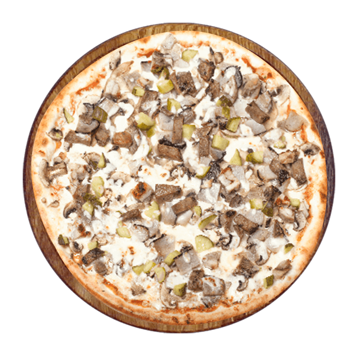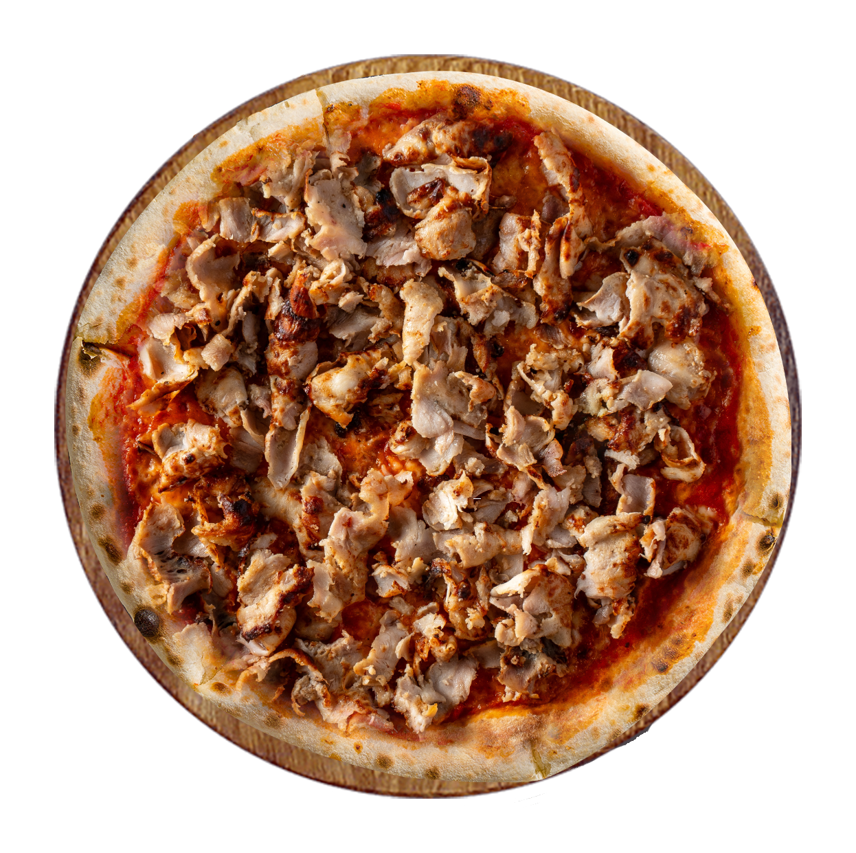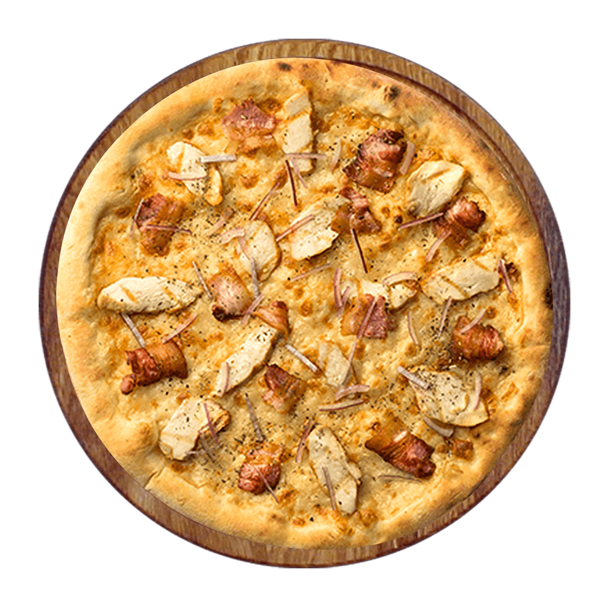 Tomate, fromage, bacon, poulet, oignons, poivrons.