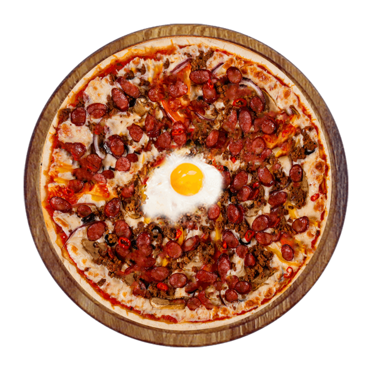 Tomate, fromage, merguez, poivrons, olives, oeuf.