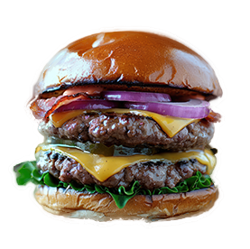 2 Steaks 90g, bacon, cheddar, crudités, sauce au choix.