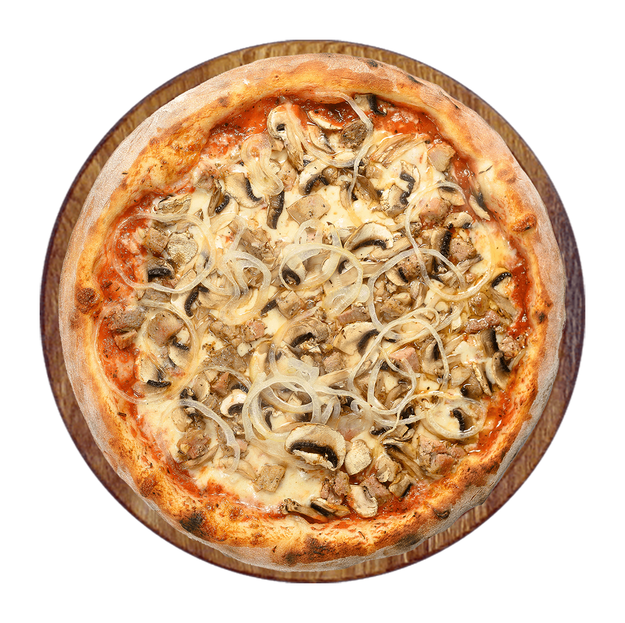 Crème fraîche, double fromage, viande hachée, poulet, raclette, oignons.