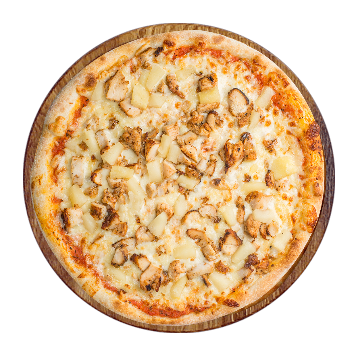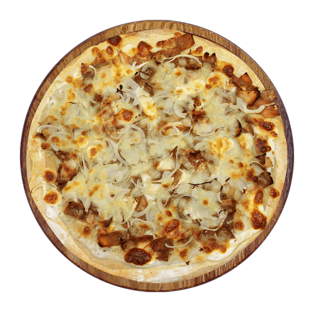 Sauce tomate, double fromage, viande hachée, poulet, chorizo, oignons.