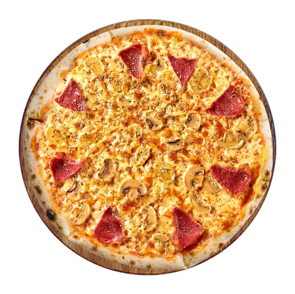 Sauce tomate, double fromage, jambon, champignons.