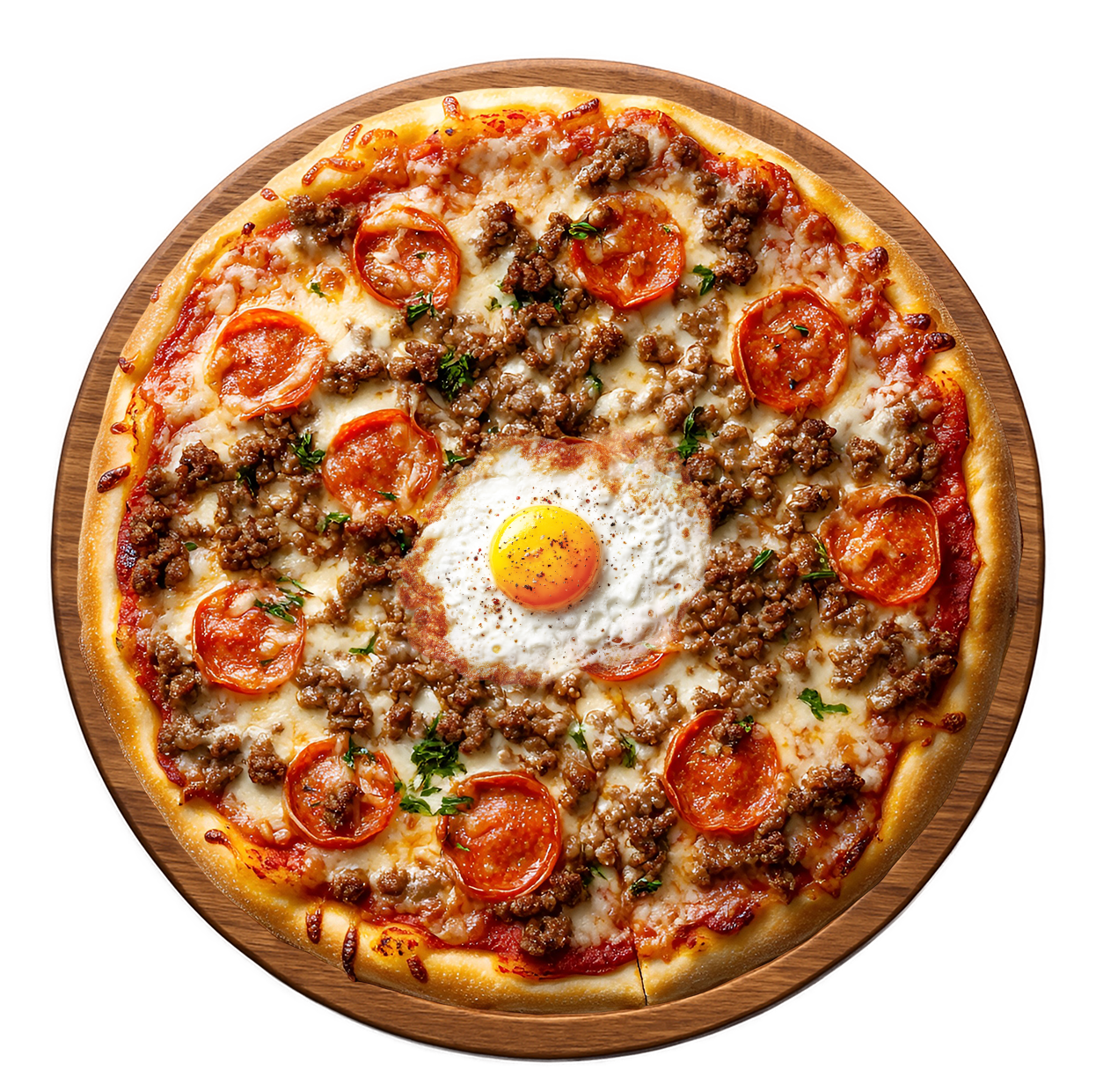 Sauce tomate, double fromage, viande hachée, merguez, oeuf.