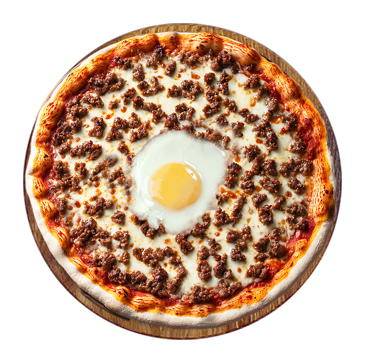 Sauce tomate, double fromage, viande hachée, champignons, oeuf.