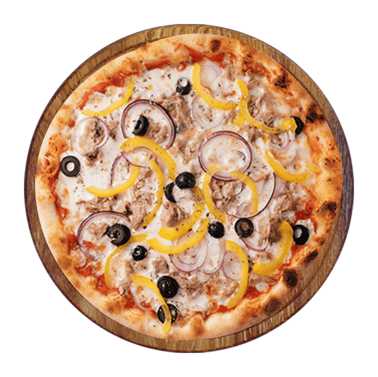 Sauce tomate, double fromage, thon, poivrons, olives, oignons.