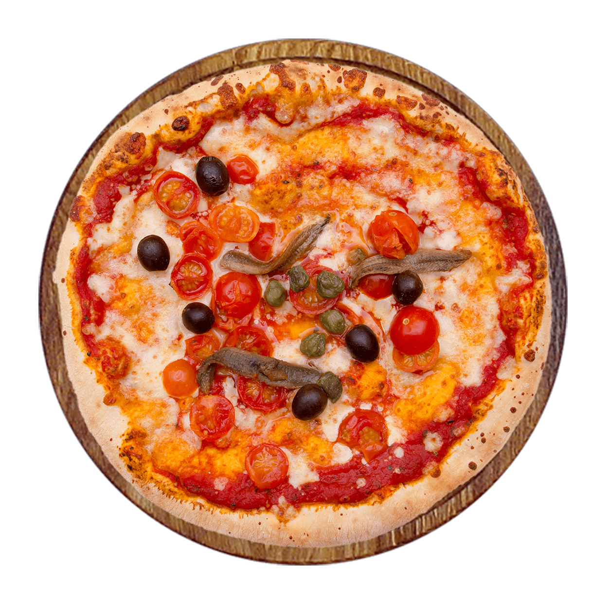 Sauce tomate, double fromage, anchois, câpres, olives.