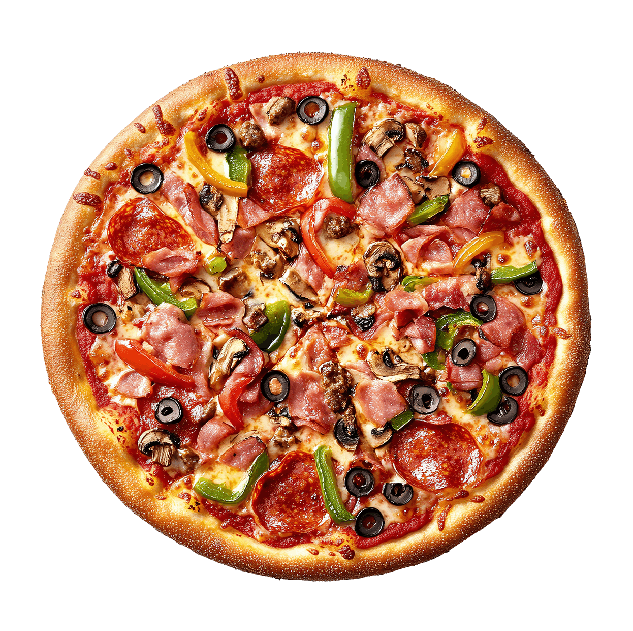 Sauce tomate, double fromage, jambon, champignons, poivrons, olives.