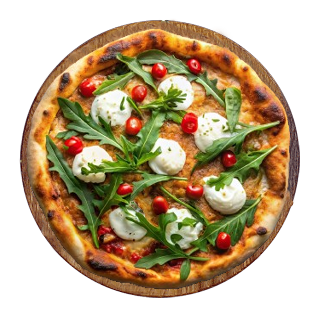 Sauce maison, burrata, tomates cerises, roquette, mozzarella.