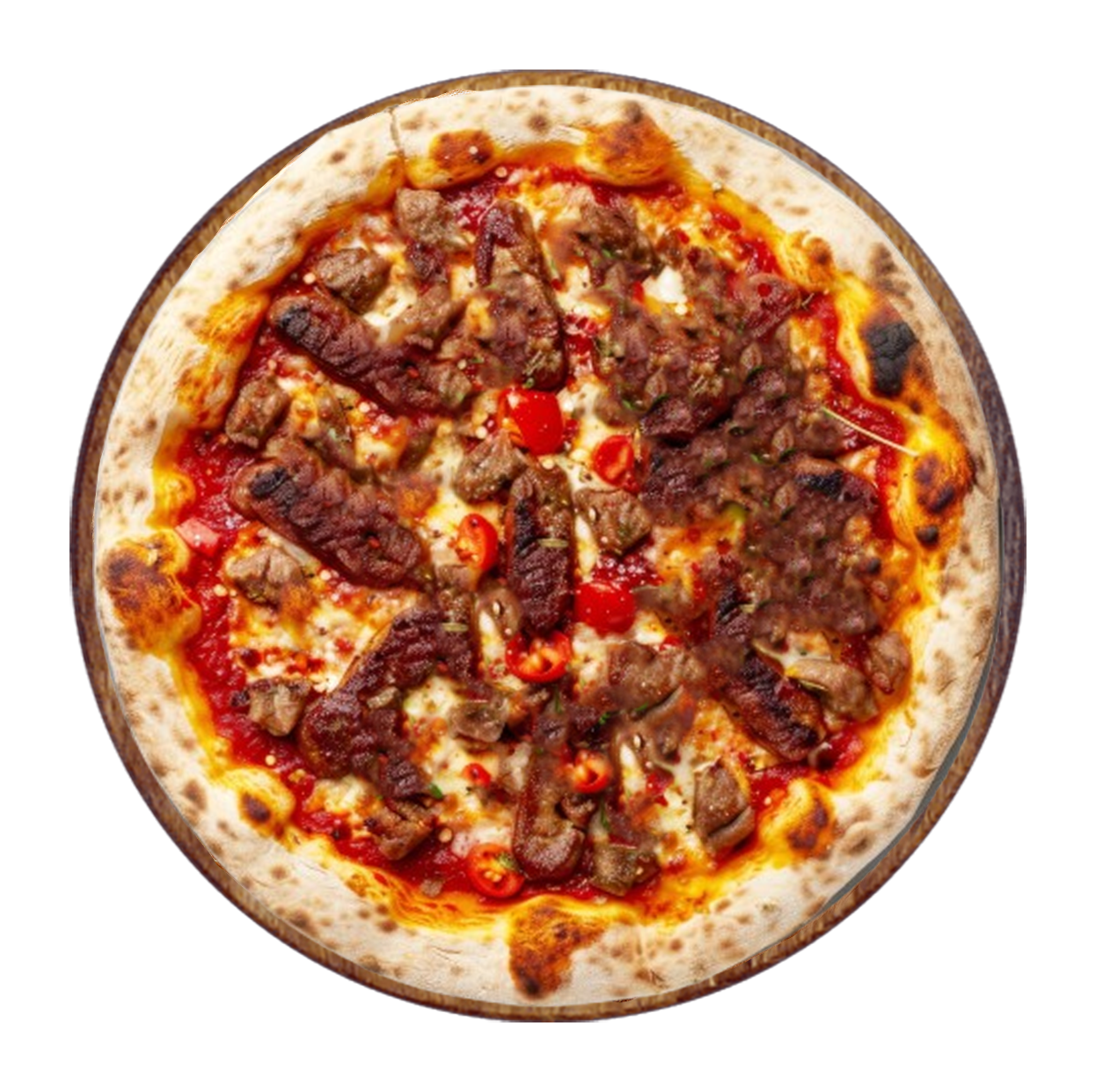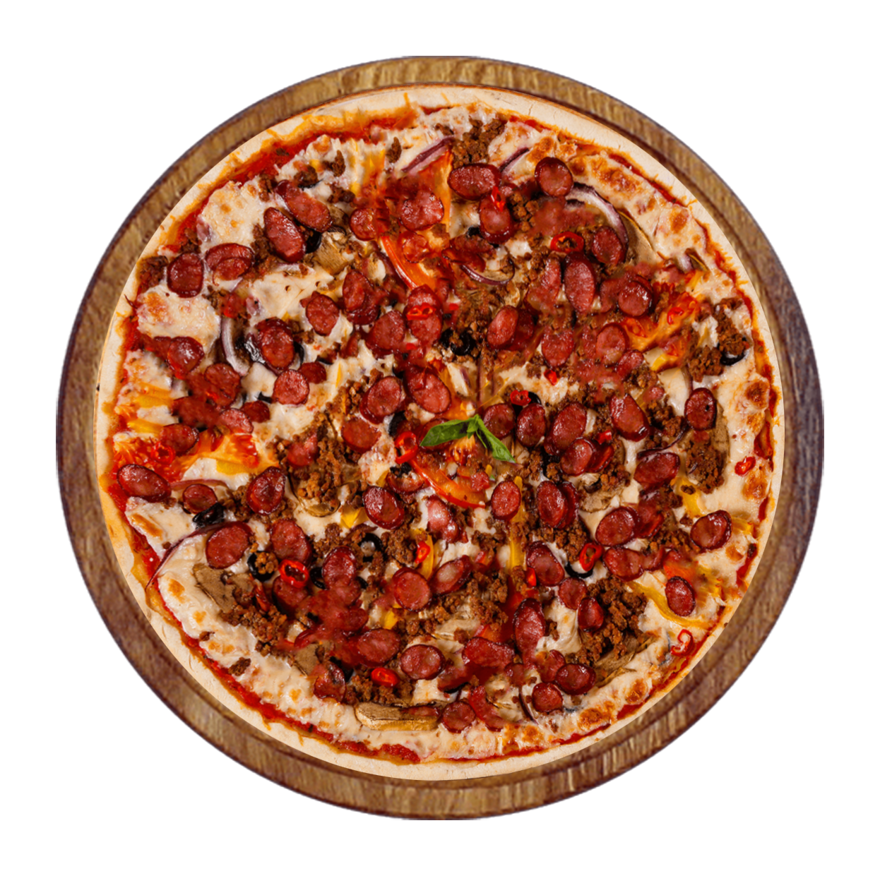 Sauce algérienne, viande hachée, merguez, olives, poivrons, mozzarella.