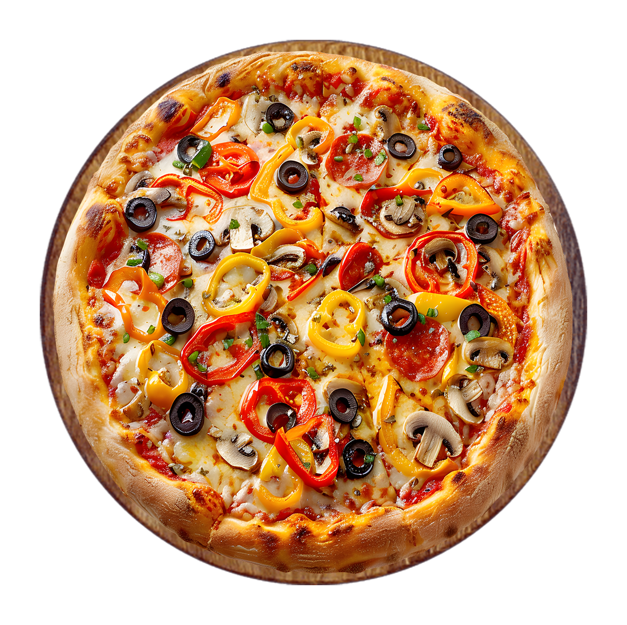 Tomate, viande hachée, champignons, poivrons, mozzarella.