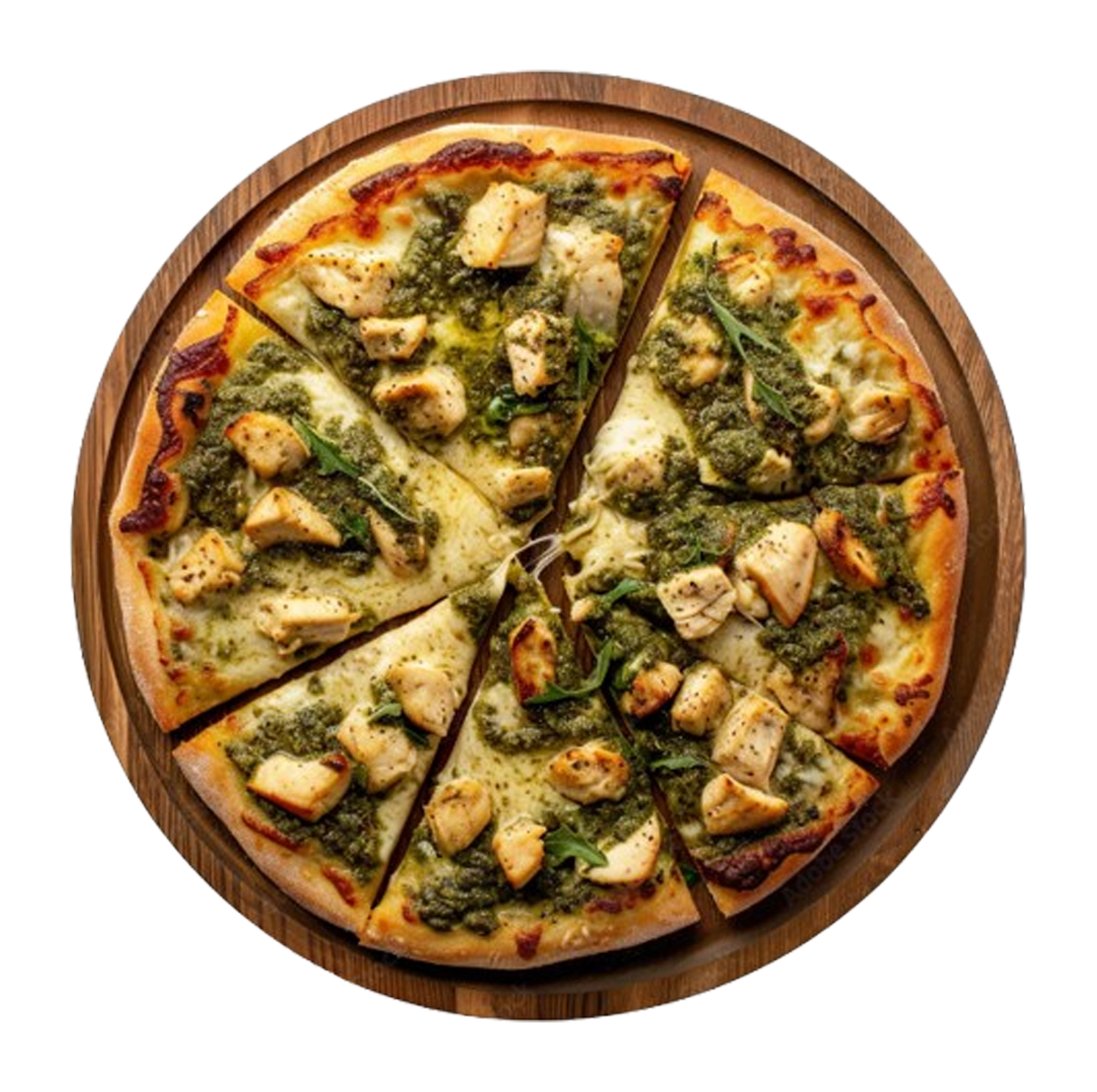 Sauce pesto, champignons, poulet, burrata, roquette, mozzarella.