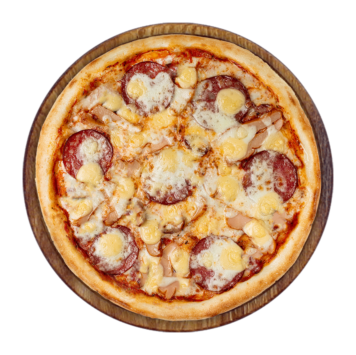 Tomate, poulet, pepperoni, pommes de terre, mozzarella.