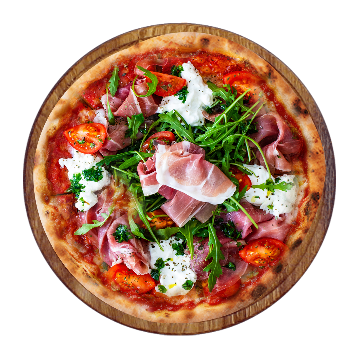 Tomate, mozzarella, roquette, jambon, tomates cerises, olives, burrata.