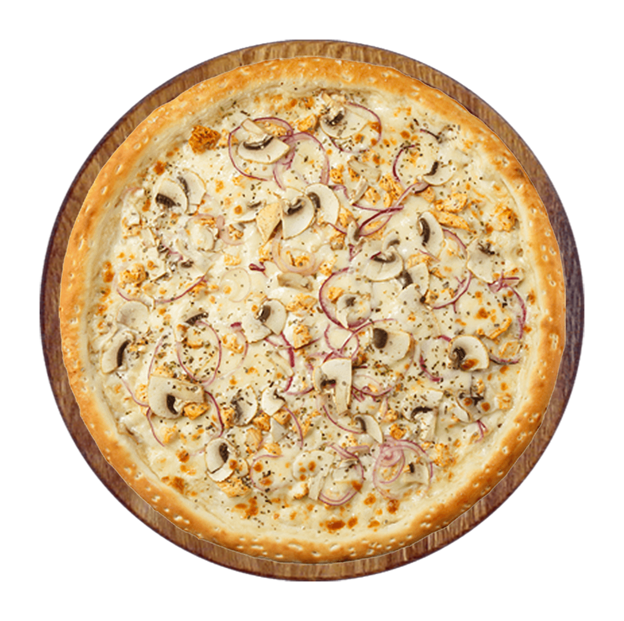 Crème fraîche, champignons, poulet, poivrons, oignons, mozzarella.