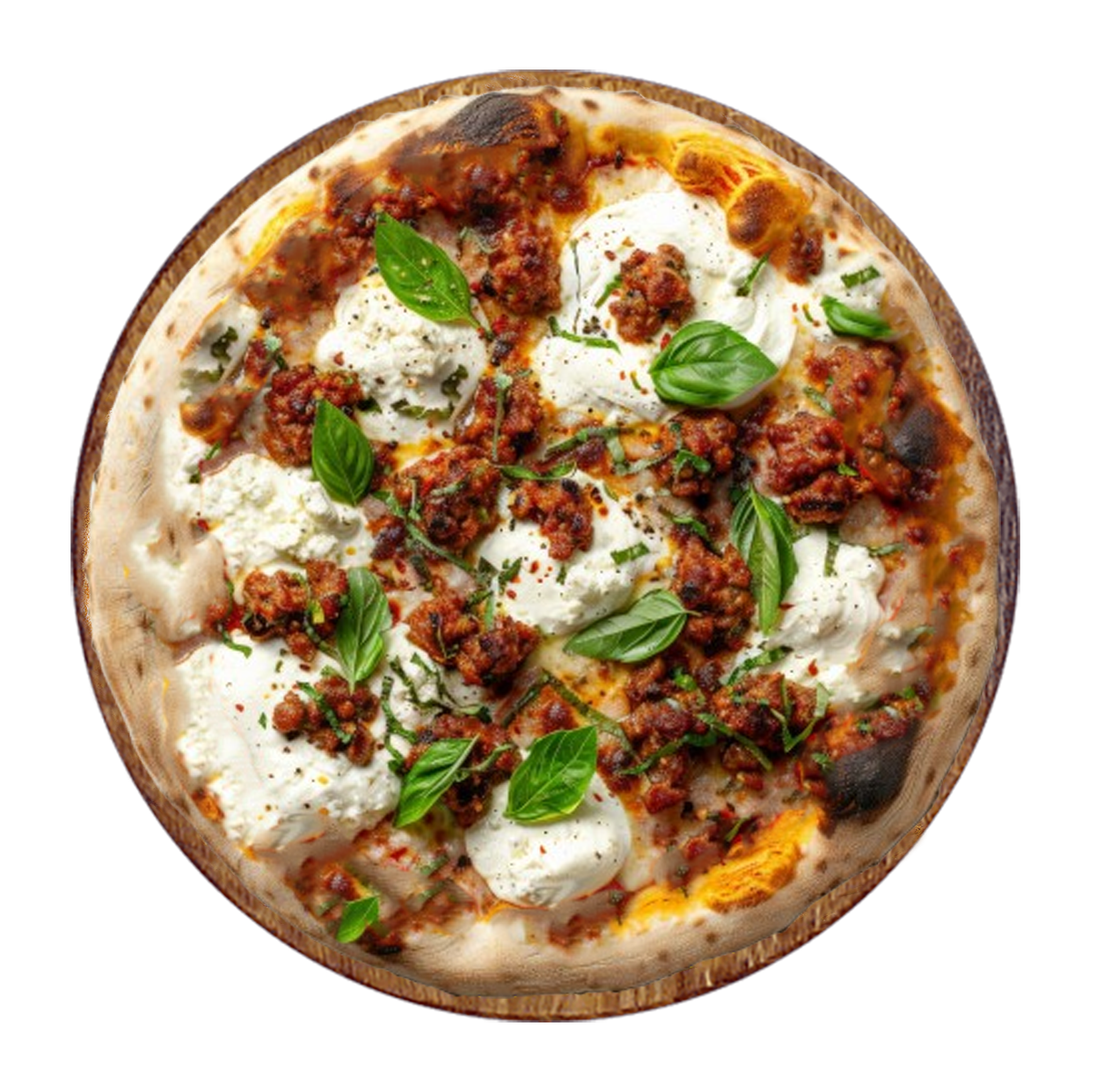 Crème fraîche, mozzarella, viande hachée, chèvre, olives, burrata.