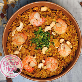 Crevettes sauce crème préparée aux amandes. Servi avec un bol de riz.
