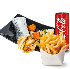 Escalope, sauce korma, salade, tomates, oignons + Frites + 1 Boisson 33cl au choix.