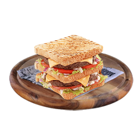 Trois steaks dans un pain toasté, cheddar, crudités, sauce au choix.