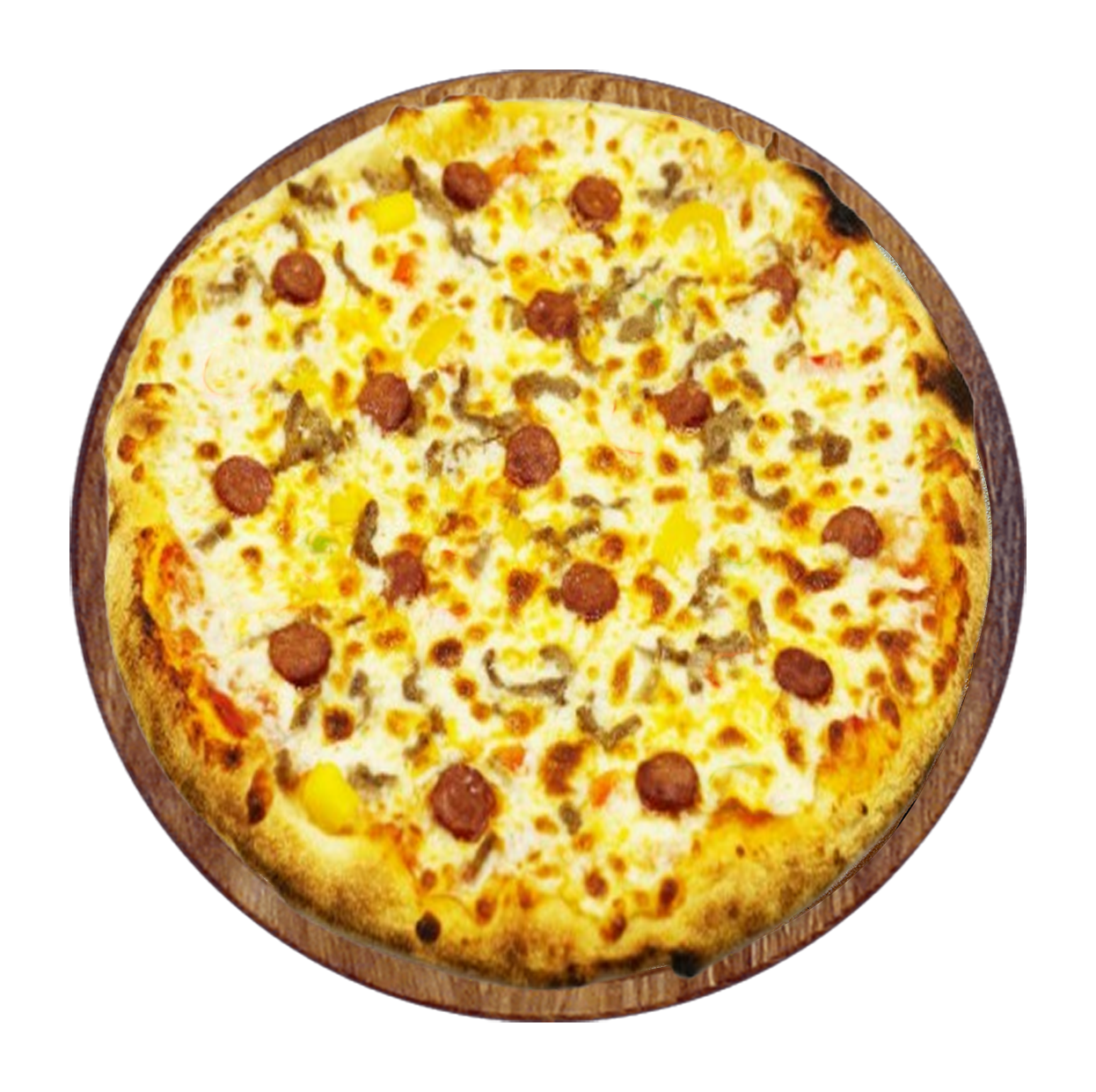 Crème fraîche, mozzarella, sauce barbecue, poulet, merguez, poivrons.