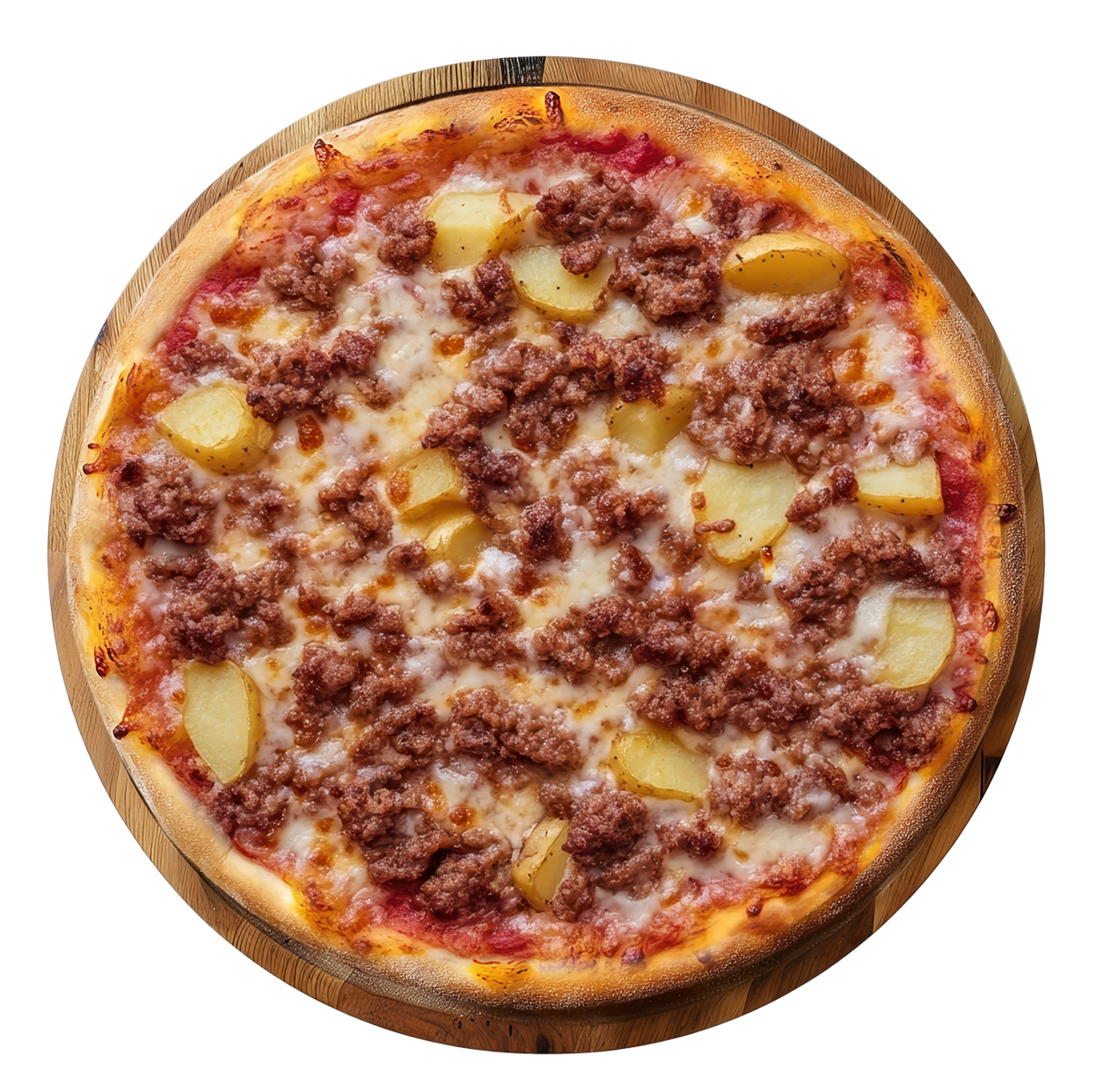 Sauce tomate, crème fraîche, mozzarella, viande hachée épicée, merguez, jambon de dinde, poivrons, olives.