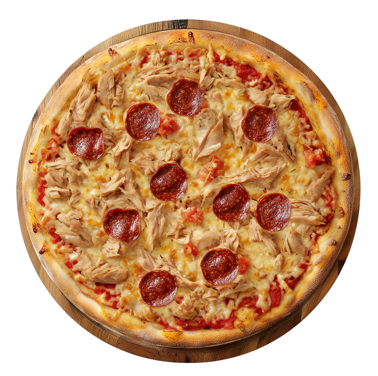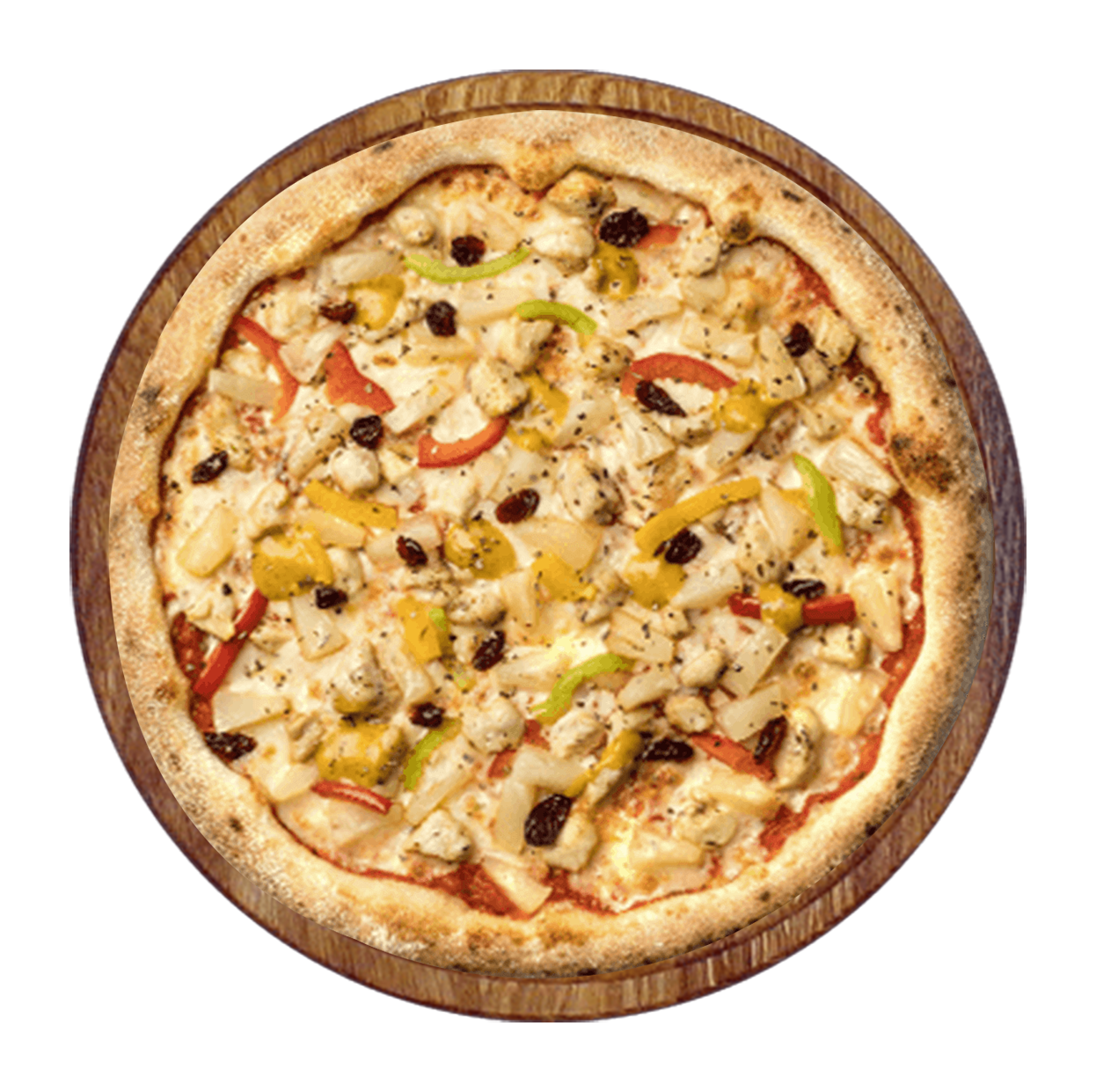 Sauce tomate, crème fraîche, mozzarella, jambon de dinde, pommes de terre, poulet, champignons, oignons.
