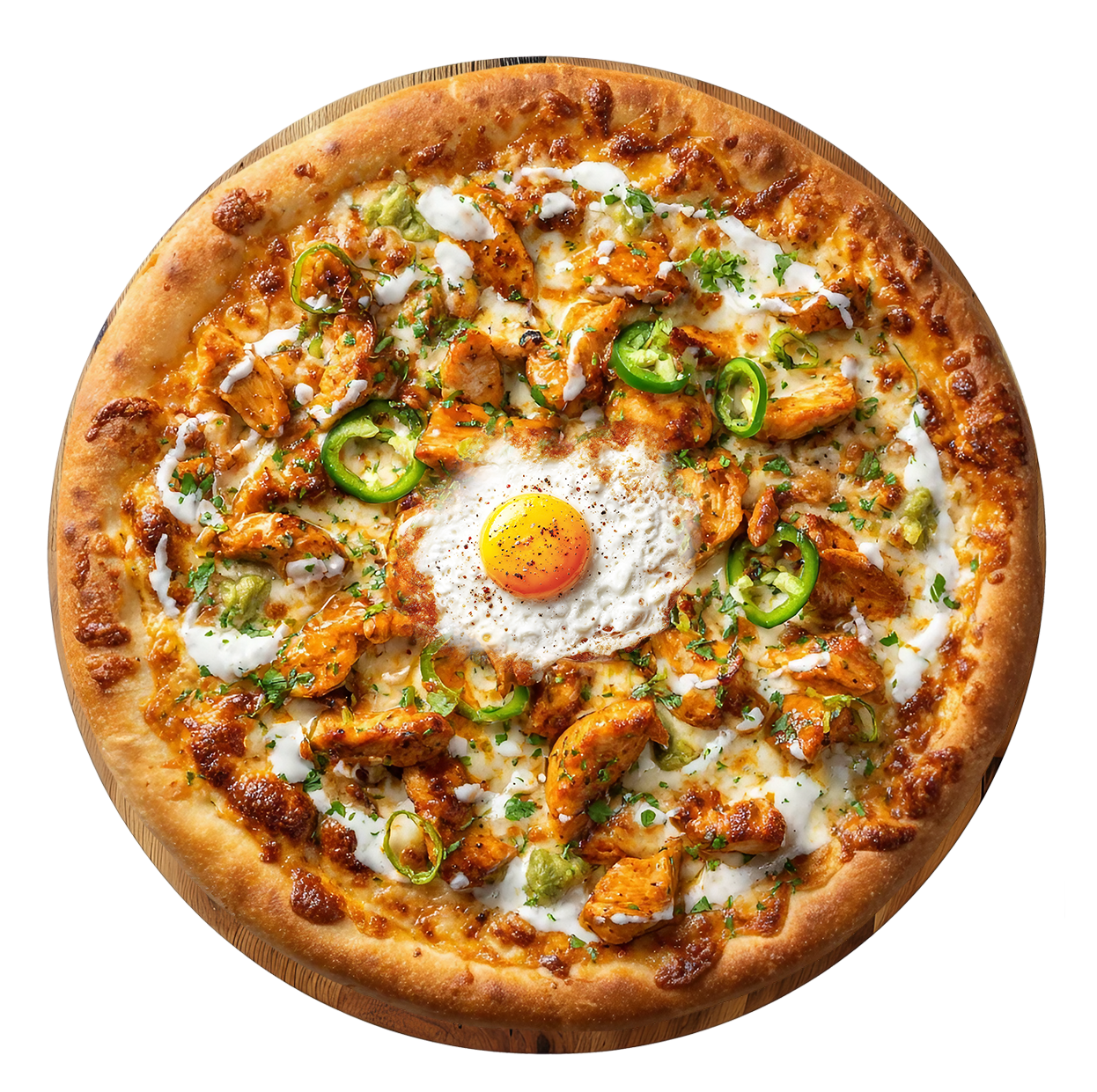Sauce tomate, crème fraîche, mozzarella, viande hachée épicée, pommes de terre, poulet, poivrons, oeuf.