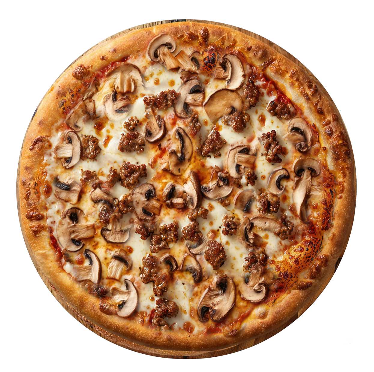 Sauce tomate, mozzarella, viande hachée, champignons.
