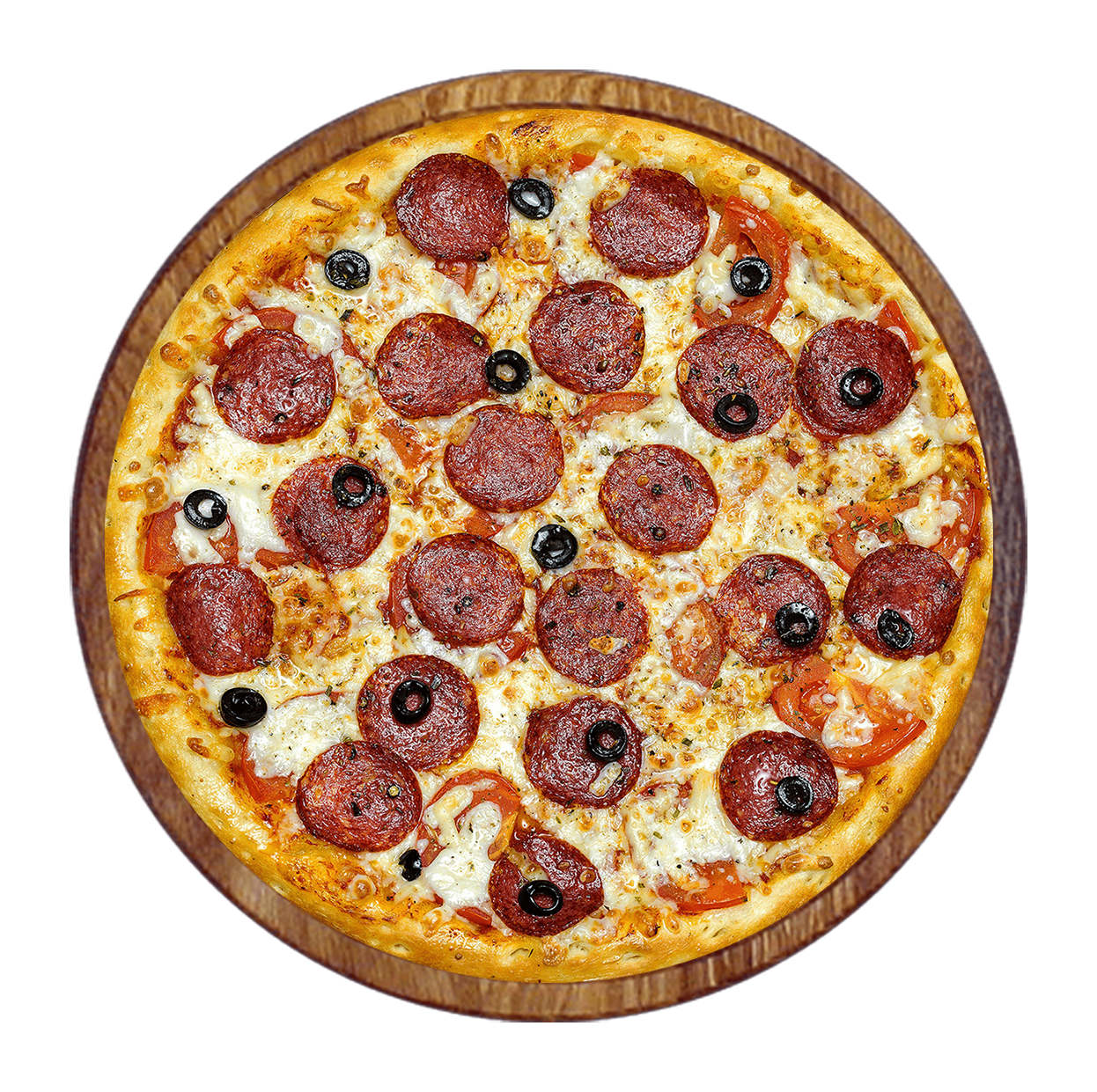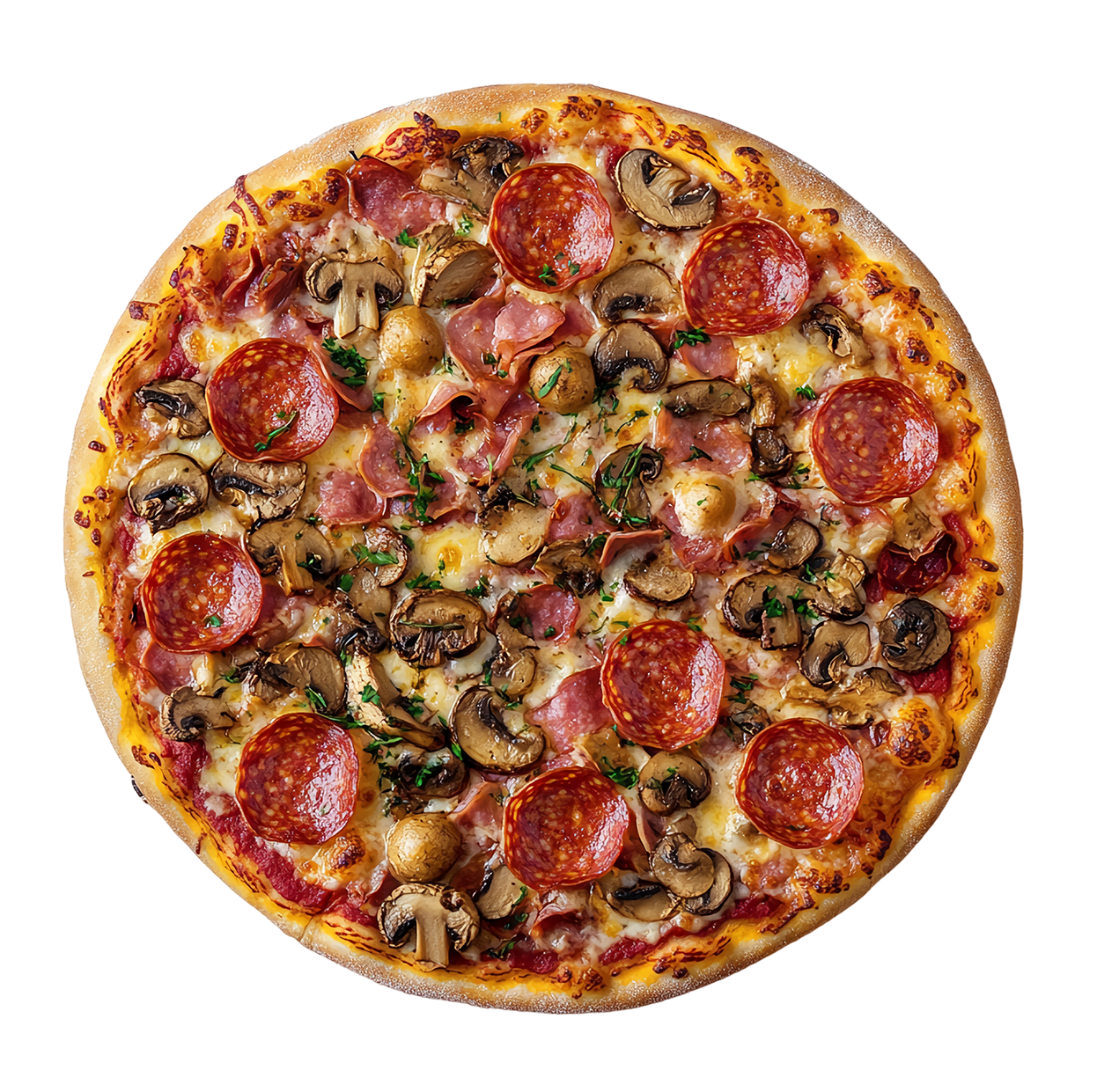 Sauce tomate, mozzarella, jambon de dinde, chorizo, merguez, champignons.