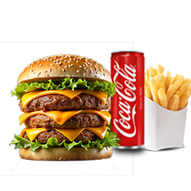 3 Steaks, 3 bacons, cheddar + Frites + 1 Boisson 33cl au choix.