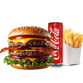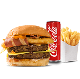 2 Steaks, 2 bacons, cheddar, filet de poulet + Frites + 1 Boisson 33cl au choix.