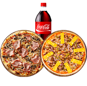 2 Pizzas méga au choix + 1 Maxi coca cola 1.25l.
