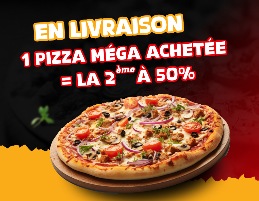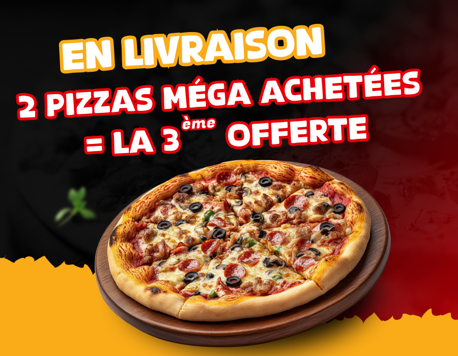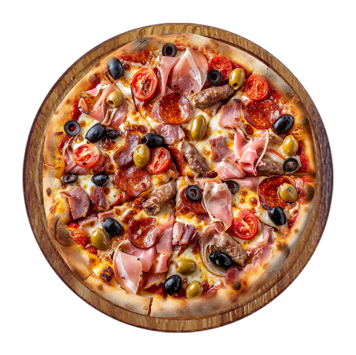 Tomate, fromage, viande hachée, jambon, merguez, olives.