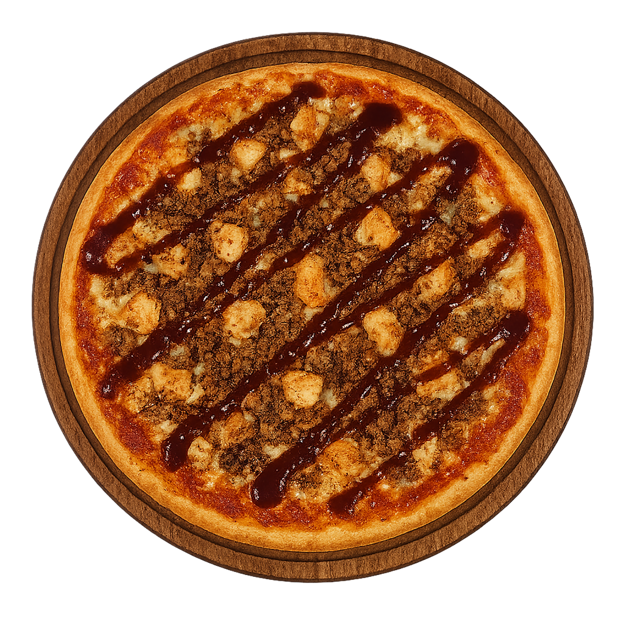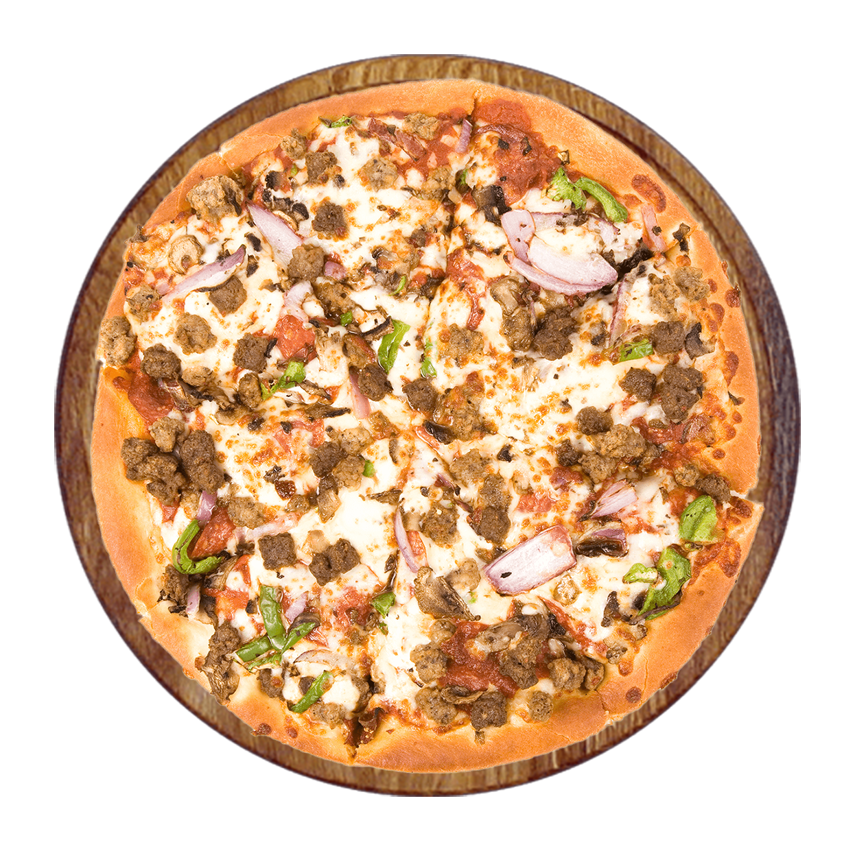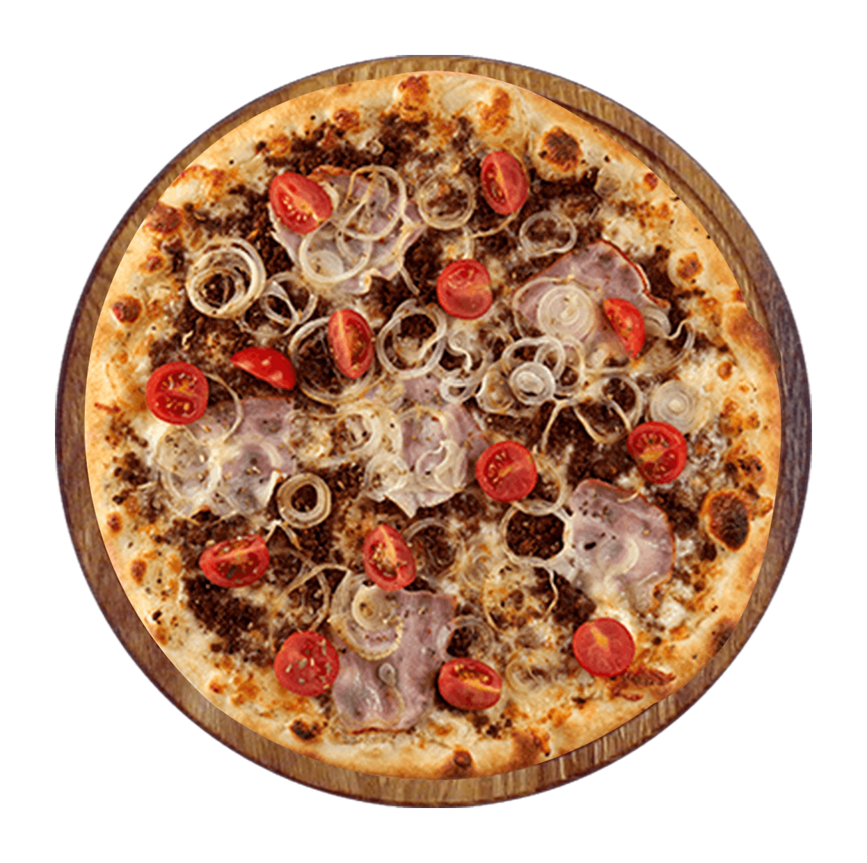 Tomate, fromage, viande hachée, jambon, merguez, oignons, olives.