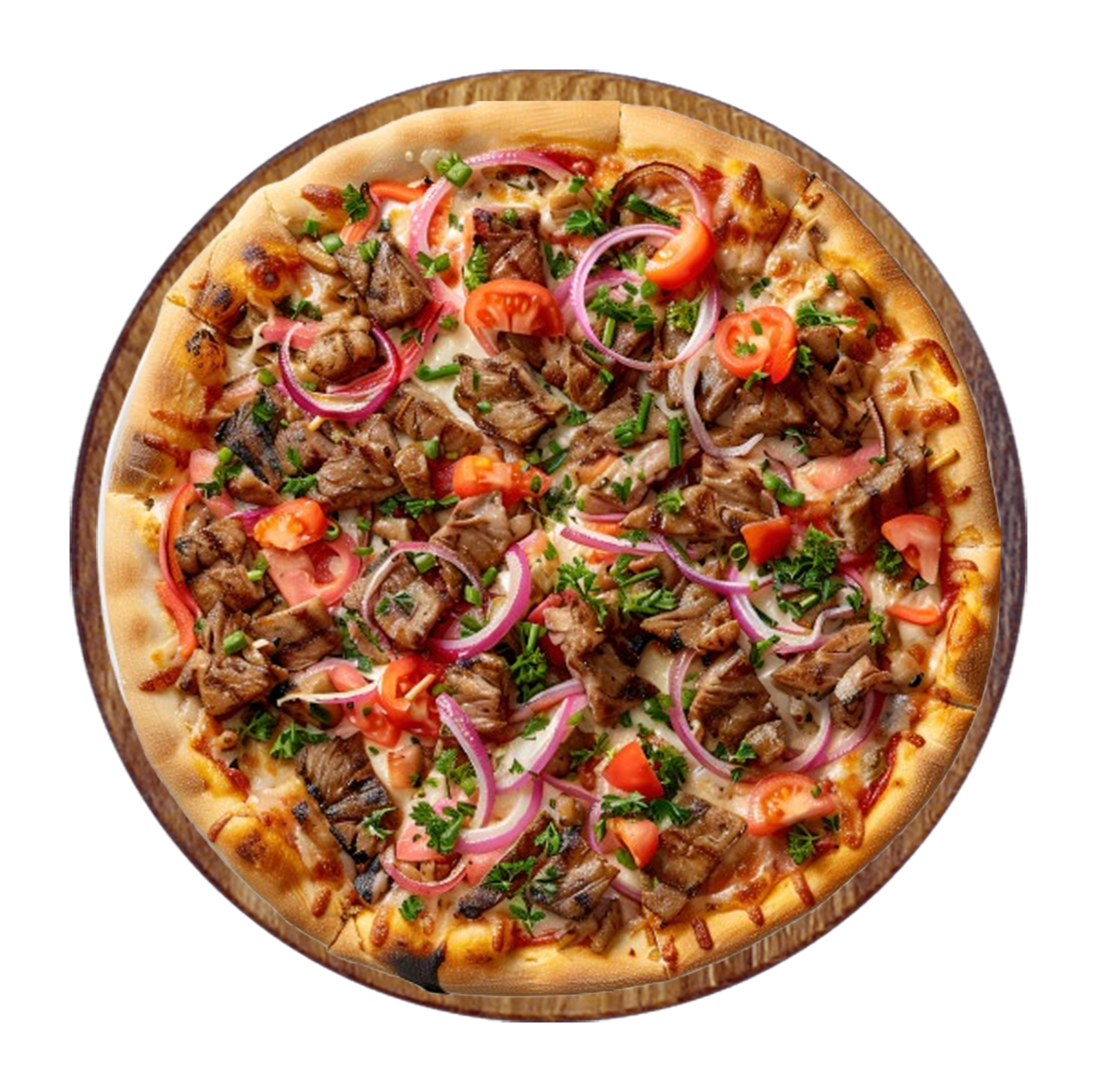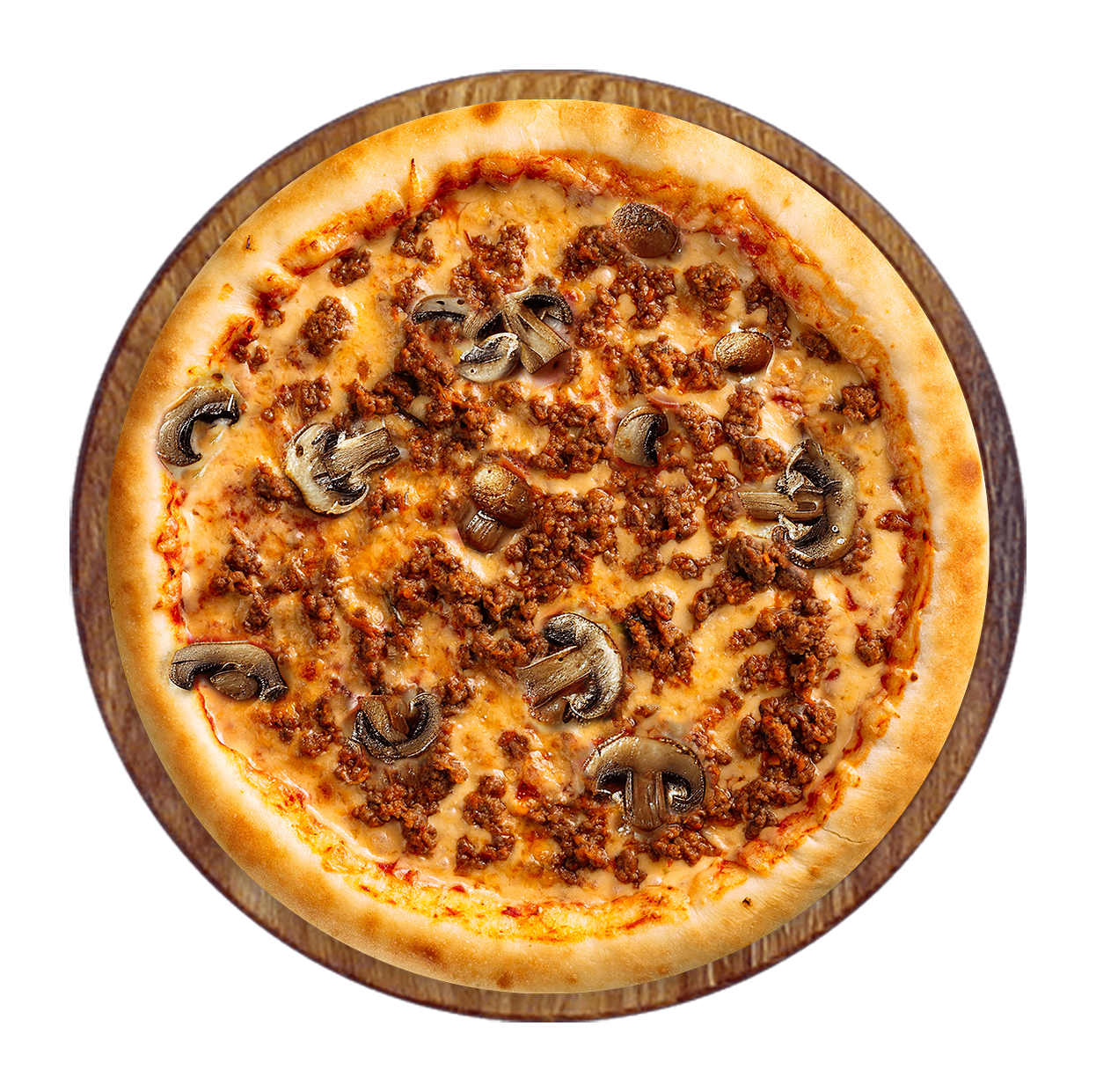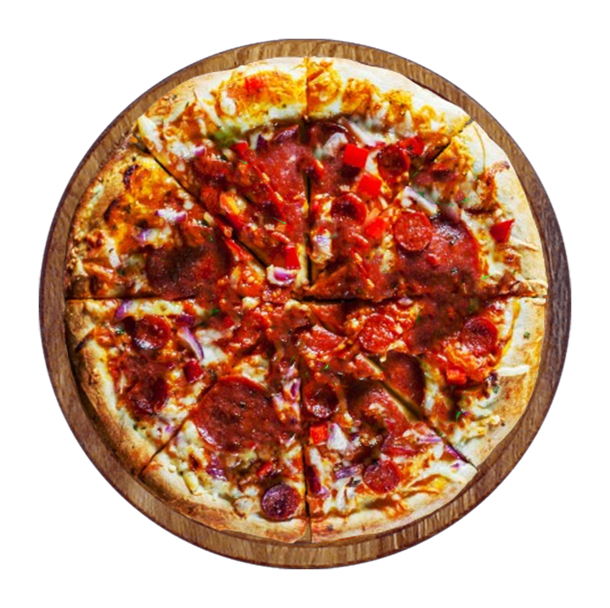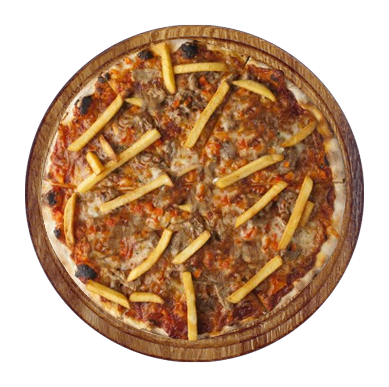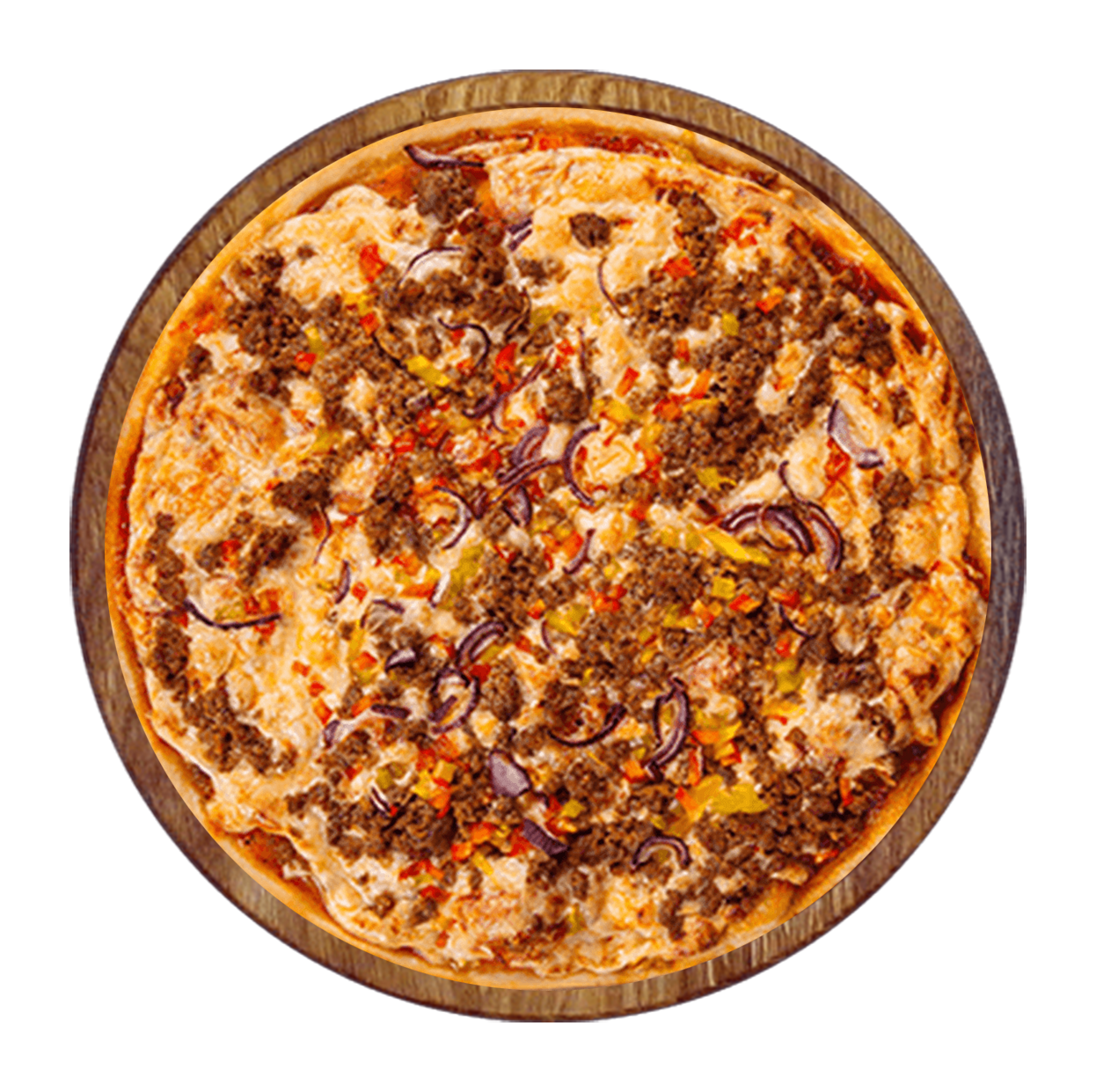 Tomate, fromage, boeuf épicé, oignons, chorizo.