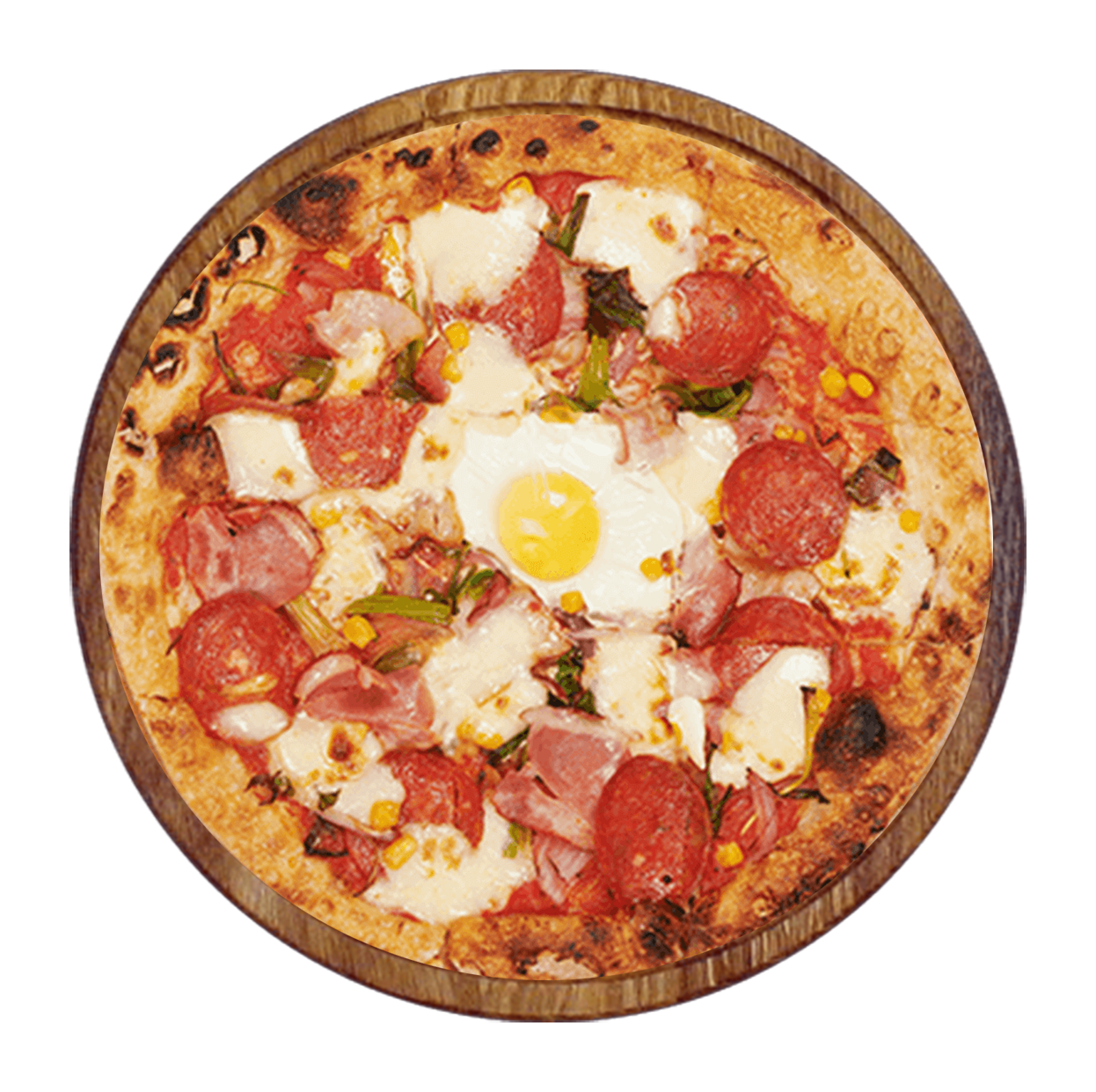 Tomate, fromage, champignons, jambon, chorizo, merguez, oeuf.