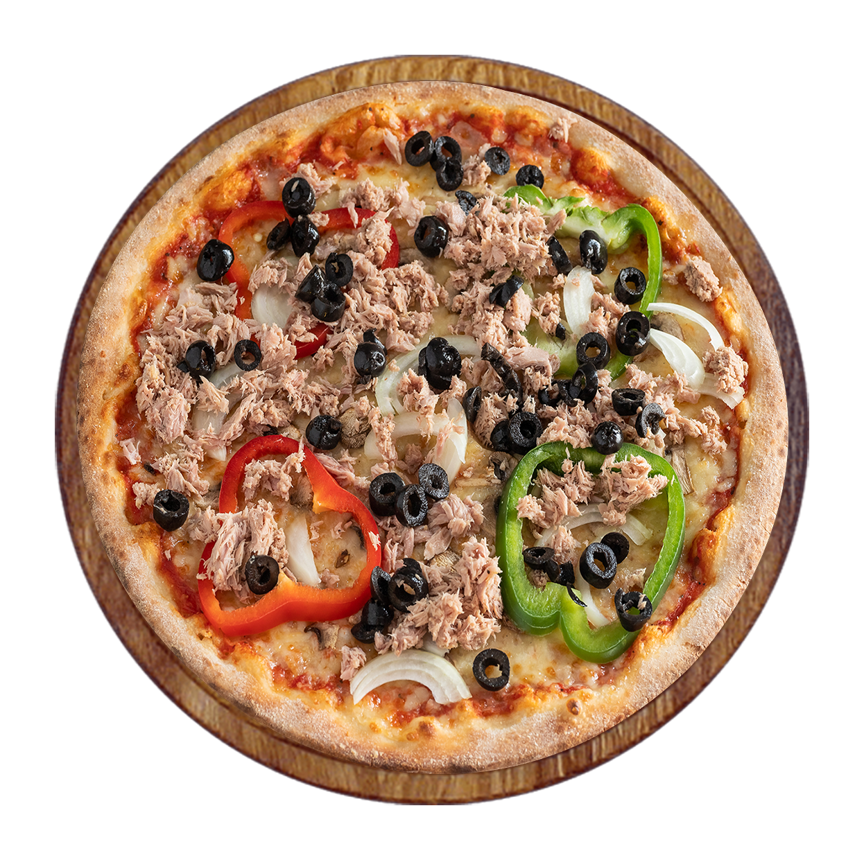 Tomate, fromage, thon, poivrons, oeuf, olives.