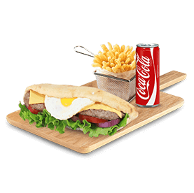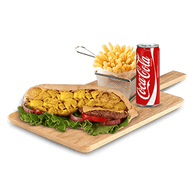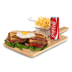 2 Steaks, 2 bacons, oeuf, cheddar + Frites + 1 Boisson 33cl au choix.