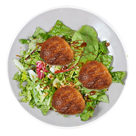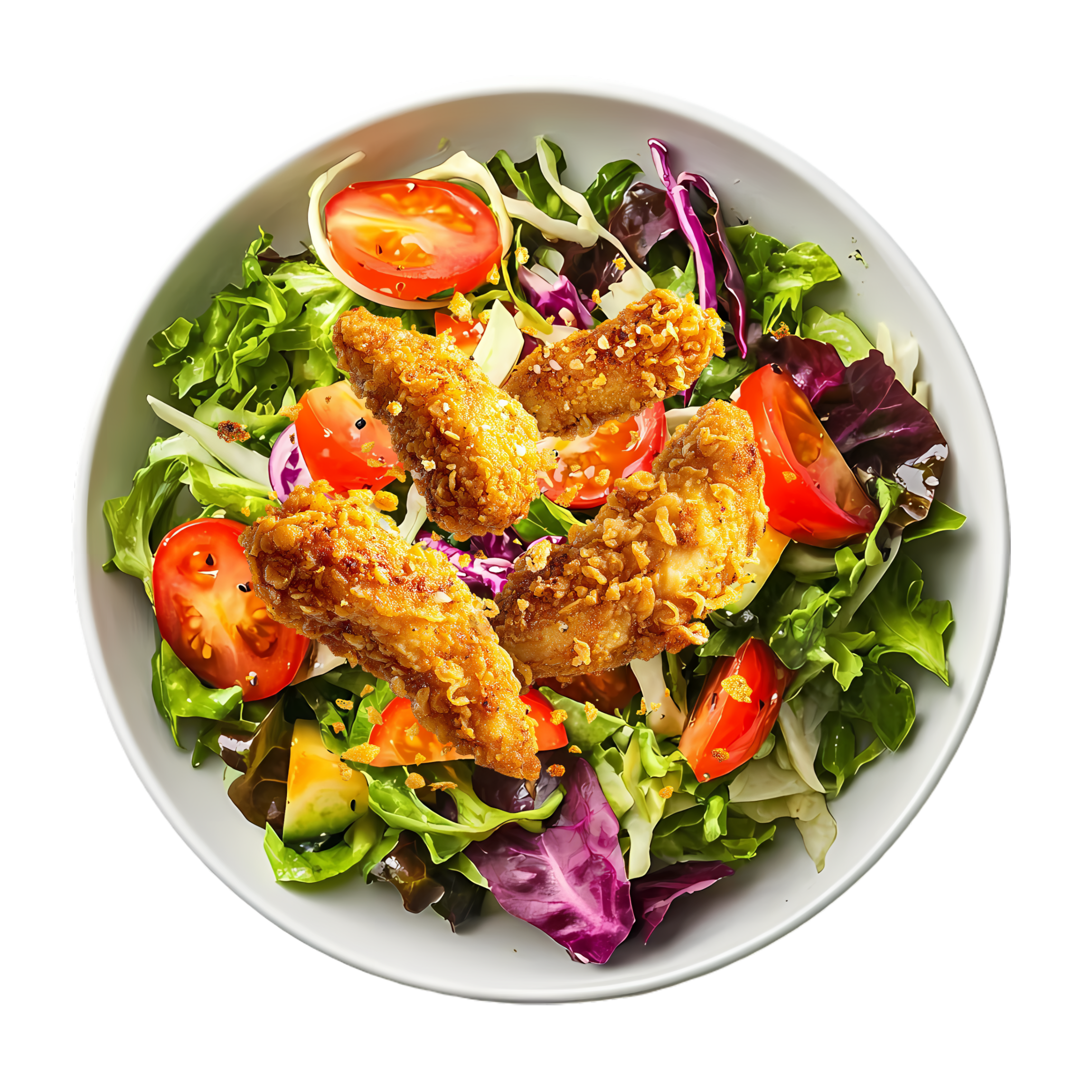 Salade, tomates, tenders, mozzarella, oignons frits.