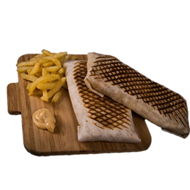 Viande de kebab, oignons caramélisés, gratiné raclette, sauce blanche.