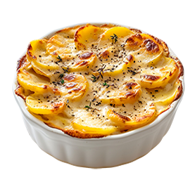 Crème fraîche, poulet mariné, pommes de terre, fromage gratiné. + Pain maison offert.