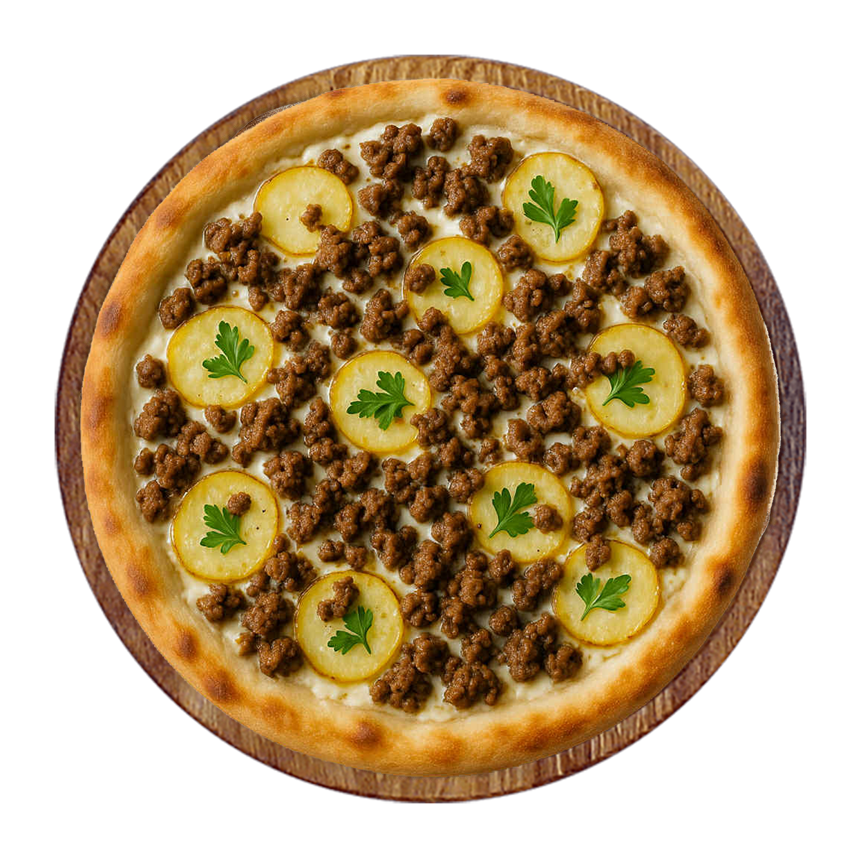 Crème fraîche, fromage, boeuf haché, pommes de terre, gorgonzola.